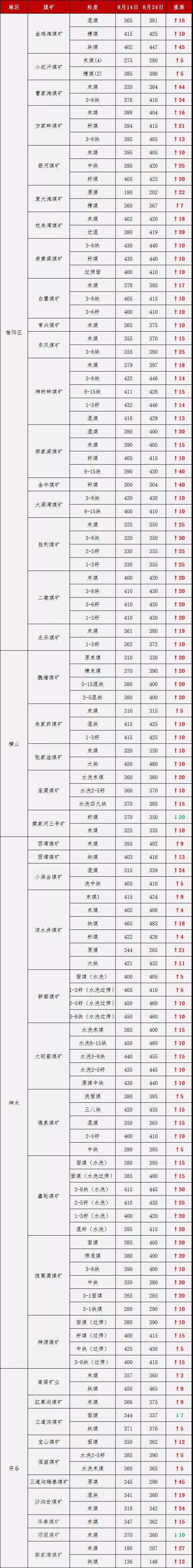 8月14日-8月24日各煤礦價(jià)格累計(jì)上漲表格: