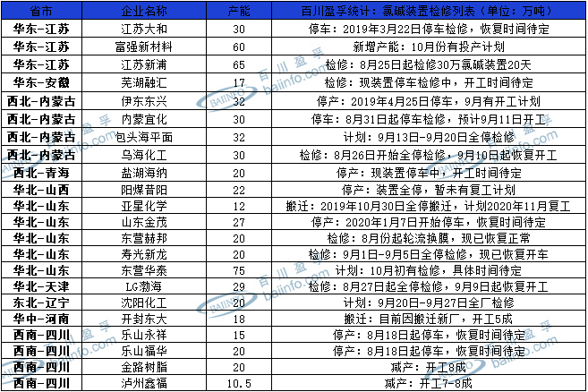 進(jìn)入9月份我國(guó)氯堿裝置開(kāi)工情況較為平穩(wěn),氯堿檢修企業(yè)較少,開(kāi)工率維持在78%-81%之間。截止9月10日,中國(guó)氯堿裝置具體檢修情況如下圖: