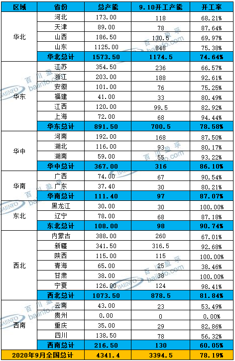 2020年9月份涉及檢修的廠(chǎng)家較少,整體開(kāi)工變化不大,主要因山東、新疆、內(nèi)蒙、河北等氯堿大省氯堿企業(yè)基本上半年完成檢修工作。