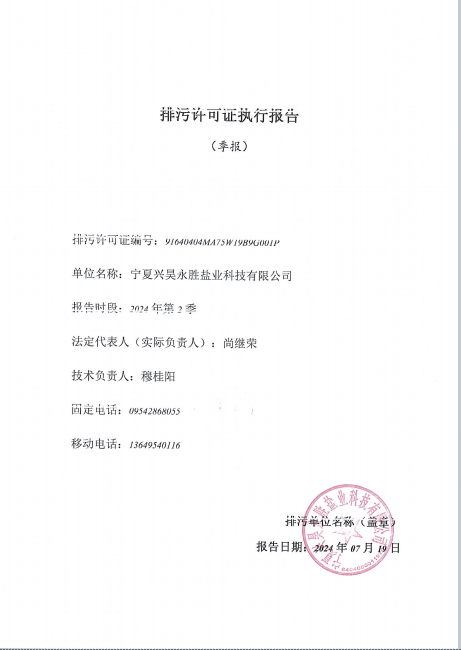 寧夏興昊永勝鹽業科技有限公司2024年第2季度排污許可執行報告